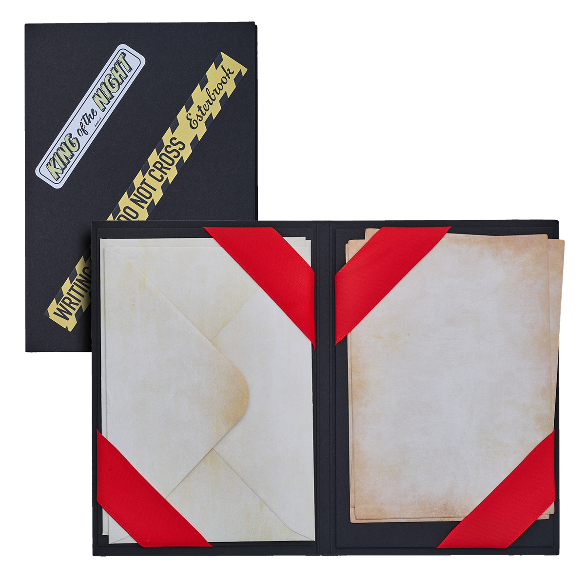 Each pen comes with a set of accessories to bring you into the world of Dracula, Transylvania, and a bit of B-movie fun. Included is a set of crime scene washi tape, antiqued stationery, and a leatherette cape-shaped pen sleeve.